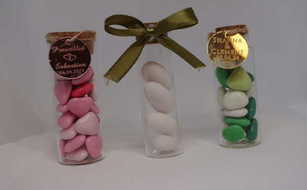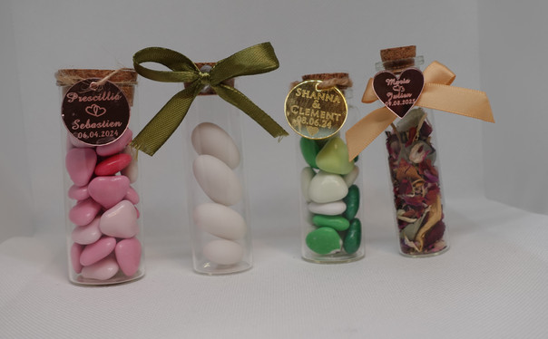 Cadeaux invités (fioles de dragées, fioles de fleurs séchées, gobelets personnalisés, pots de miel…)